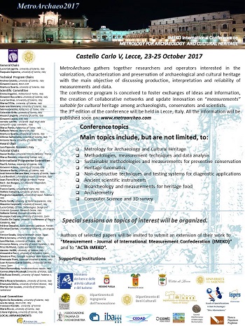 Summarizing, METROARCHAEO2017 is designed to profit of a multidisciplinary approach to give to the Cultural heritage community, from archaeologists to historians, conservators, engineers, material scientists, etc… a complete picture of the measurements utilizations and data treatments with the ultimate goal of increasing knowledge on the characterization and safeguard of archaeological and historic heritage, generally addressed in sectorial conferences.